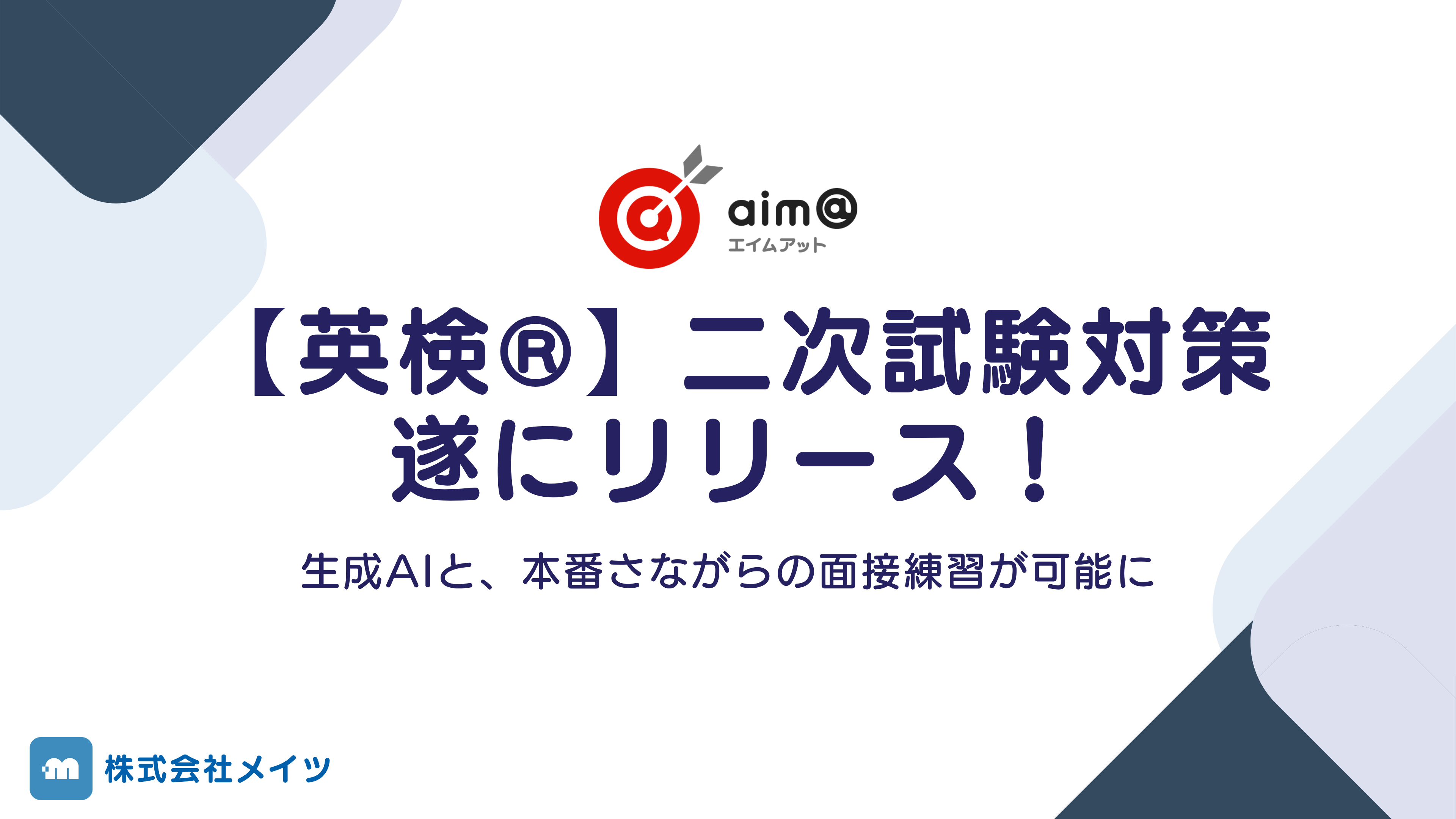 EdTech企業の株式会社メイツ(本社:東京都新宿区、代表取締役:遠藤尚範)は、2025年10月7日、提供する学習プラットフォームaim@(エイムアット)に、生成AIを活用した【英検®】二次試験対策コンテンツを新たにリリースしました。本コンテンツは、生成AIによる発音評価や模擬面接機能を通じて、生徒一人ひとりのスピーキング能力向上をサポートし、指導者の負担を大幅に軽減します。多くの塾でご活用いただいている【英検®】一次試験対策に続き、二次試験までaim@一つで対策が完結します。なお、本コンテンツは開発元である株式会社メイツが運営する学習塾での実証実験を終えており、すでに学習効果や合格実績が確認されています。